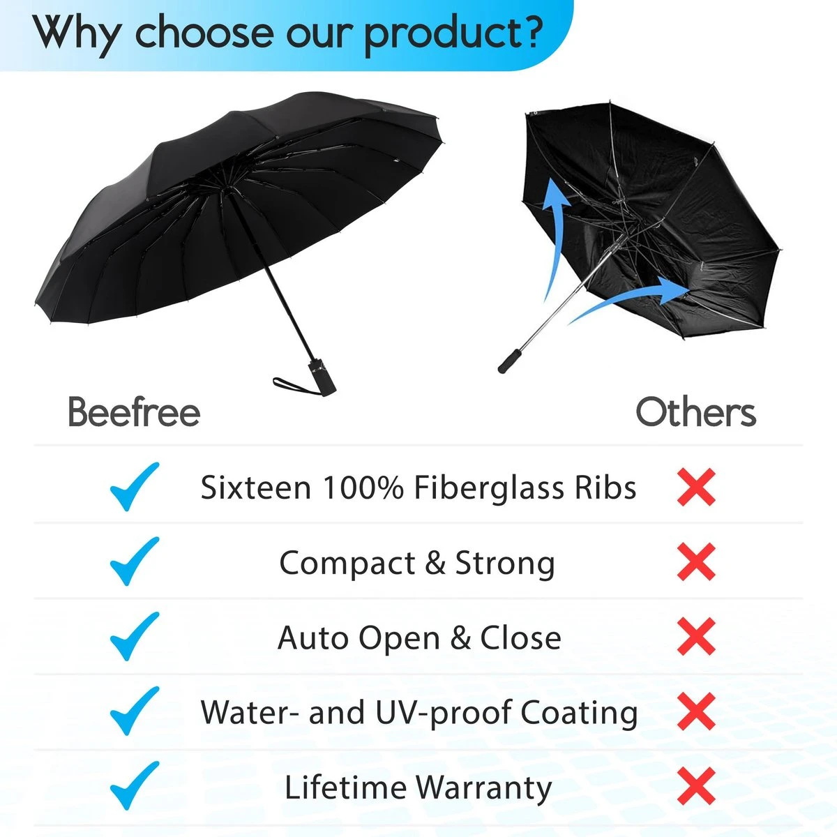 Als je opzoek bent naar een beest van een paraplu kun je stoppen met zoeken. Deze paraplu bestaat uit maarliefst 16 glasvezel panelen wat zorgt voor een enorm sterke paraplu. Let op, de paraplu is hierdoor ook zwaarder dan de reguliere automatische paraplu’s. Reguliere paraplu’s wegen ongeveer 400+ gram en deze weegt 612 gram. Hou hier dus rekening mee.
