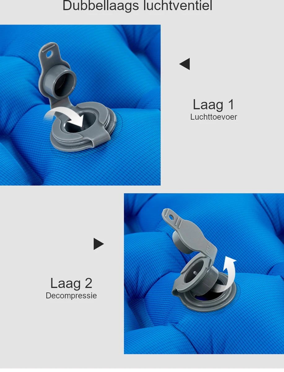 Met een maximale hoogte van maar liefst 6,5cm en het unieke ontwerp van de luchtkussentjes wordt het lichaam goed ondersteund voor zowel buik-, zij- als rugslapers! Verder zorgt het ontwerp voor een goede afsluiting van de koude ondergrond, waardoor je lichaam warm blijft gedurende de nacht. Met een pakformaat van 8 x 22cm en een gewicht van ~600 gram kan je dit luchtbed gemakkelijk meenemen tijdens al je outdoor avonturen!