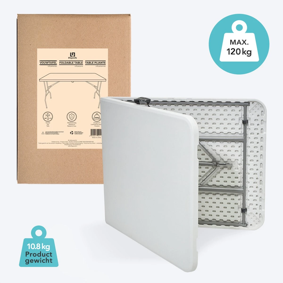 Ga je met het hele gezin barbecueën in de tuin? Of is er iemand jarig? Dan is de klaptafel van LifeGoods de perfecte oplossing! Het tafelblad heeft een afmeting van 180 bij 70 cm waardoor er meer dan genoeg ruimte is voor 6 tot 8 personen. Doordat de klaptafel weer- en corrosiebestendig kun je de tafel zonder zorgen het hele jaar buiten gebruiken. De klaptafel heeft een stevig metalen frame en een draagkracht van wel 120 kg. Je klapt de tafel binnen een paar seconden eenvoudig uit.